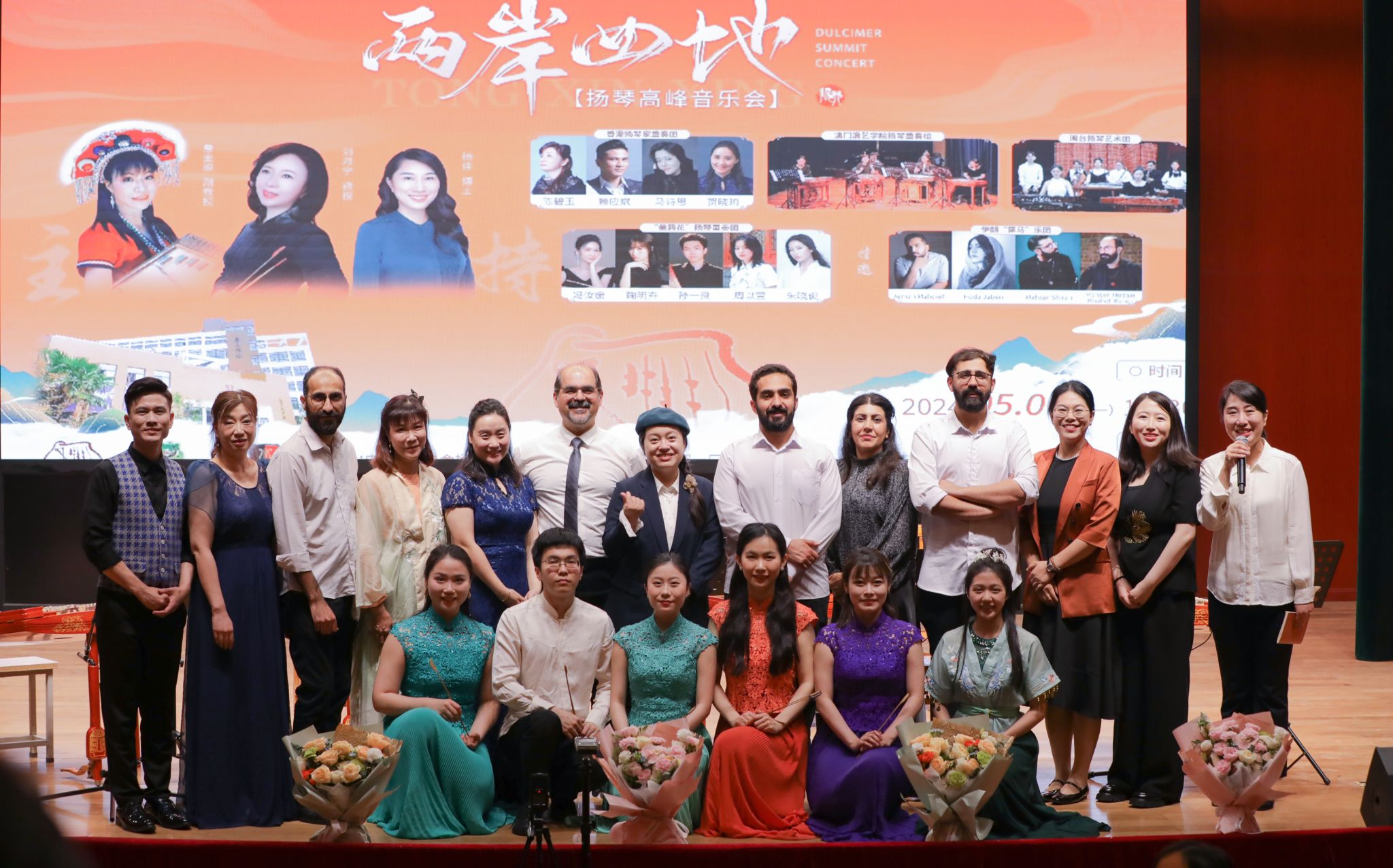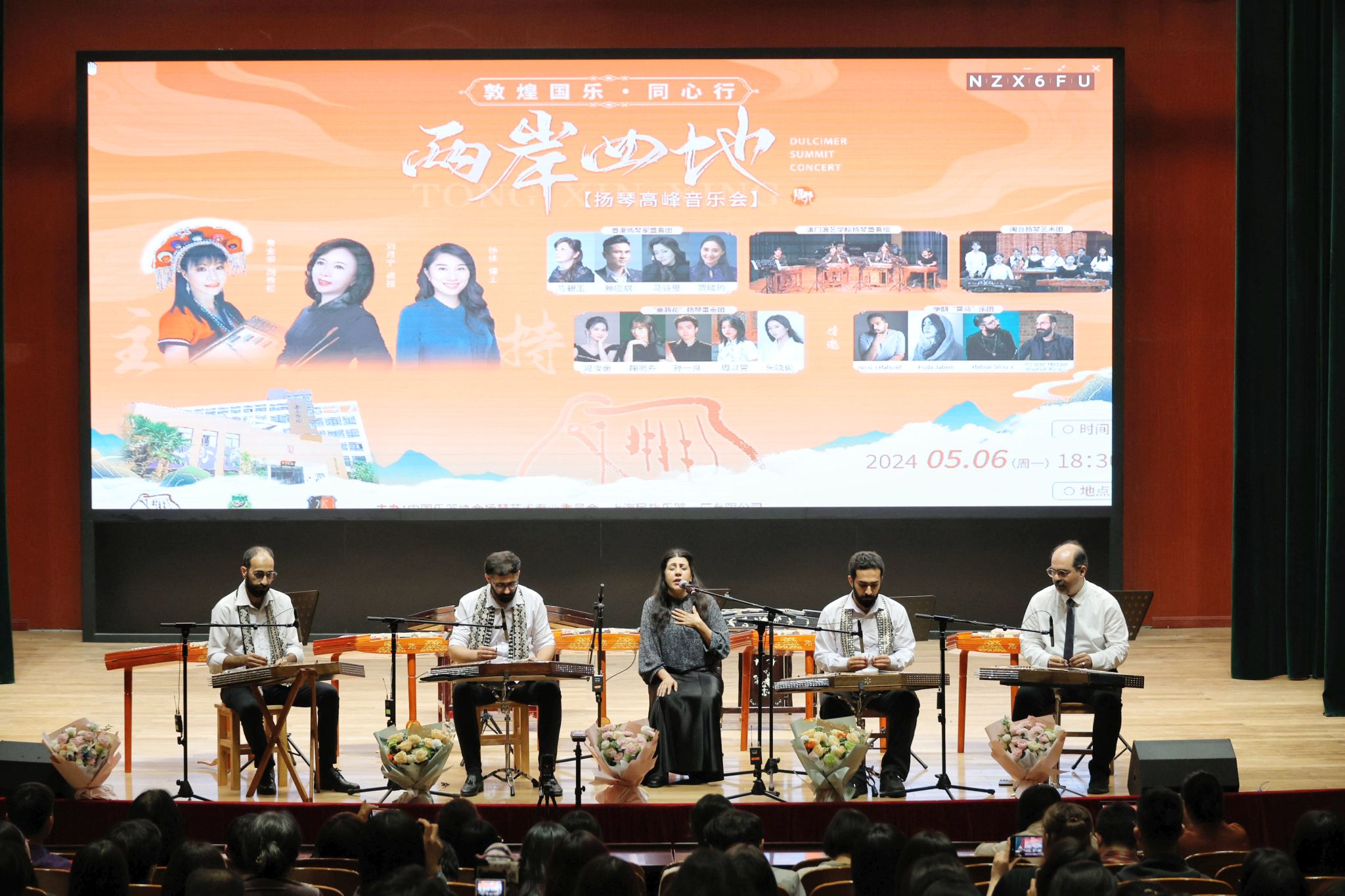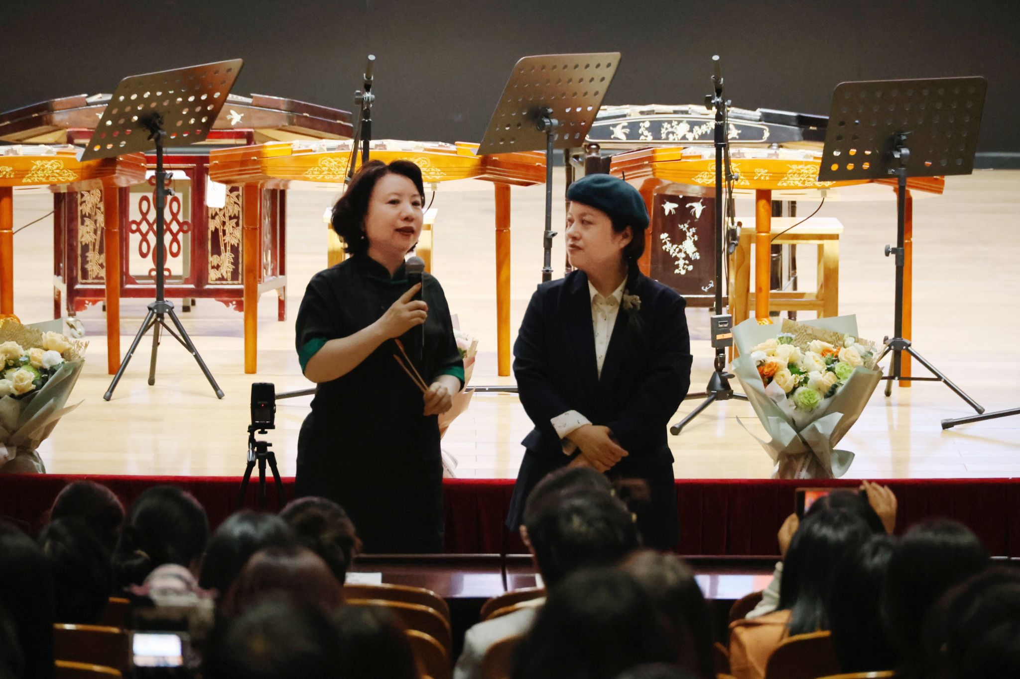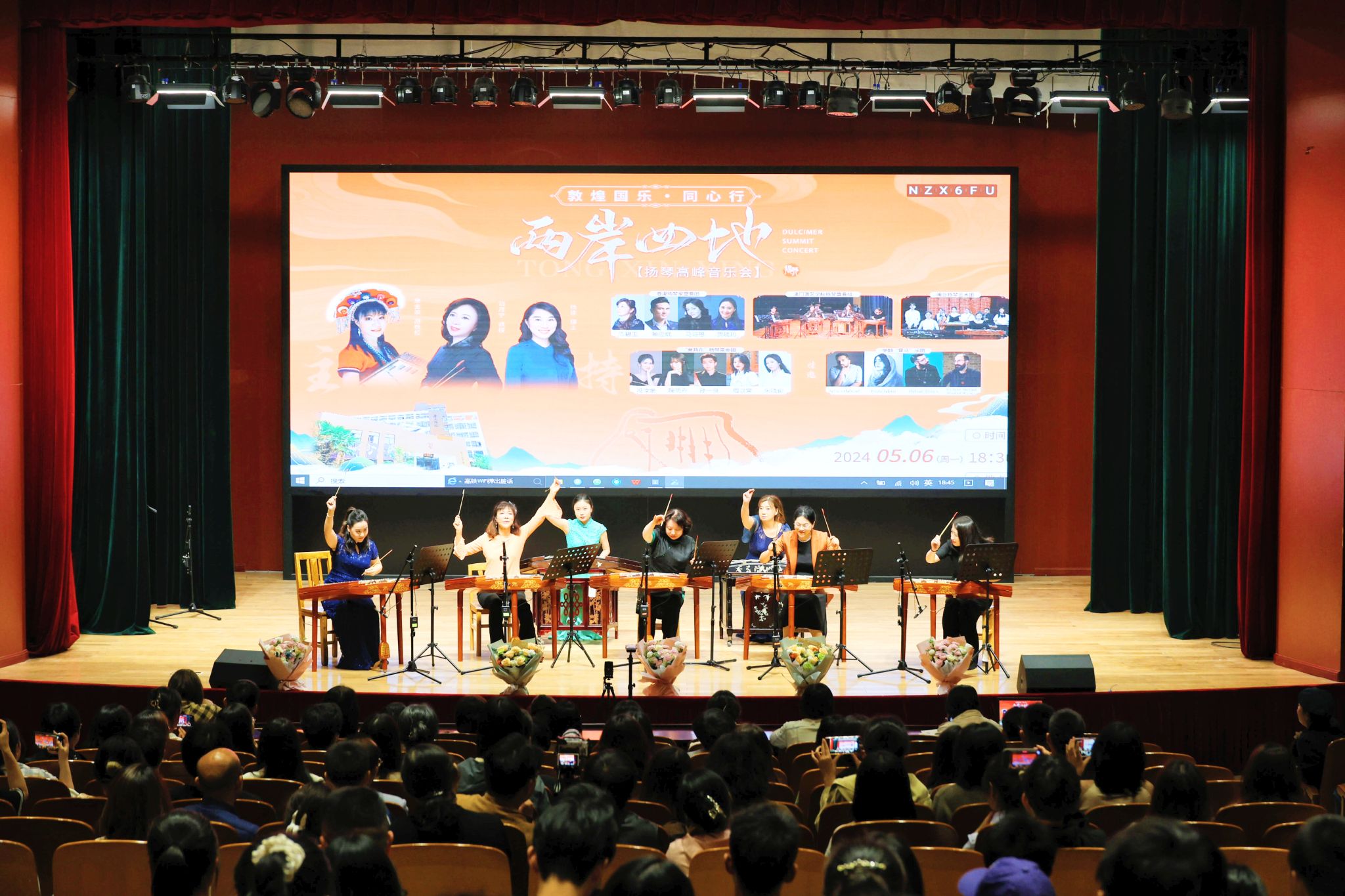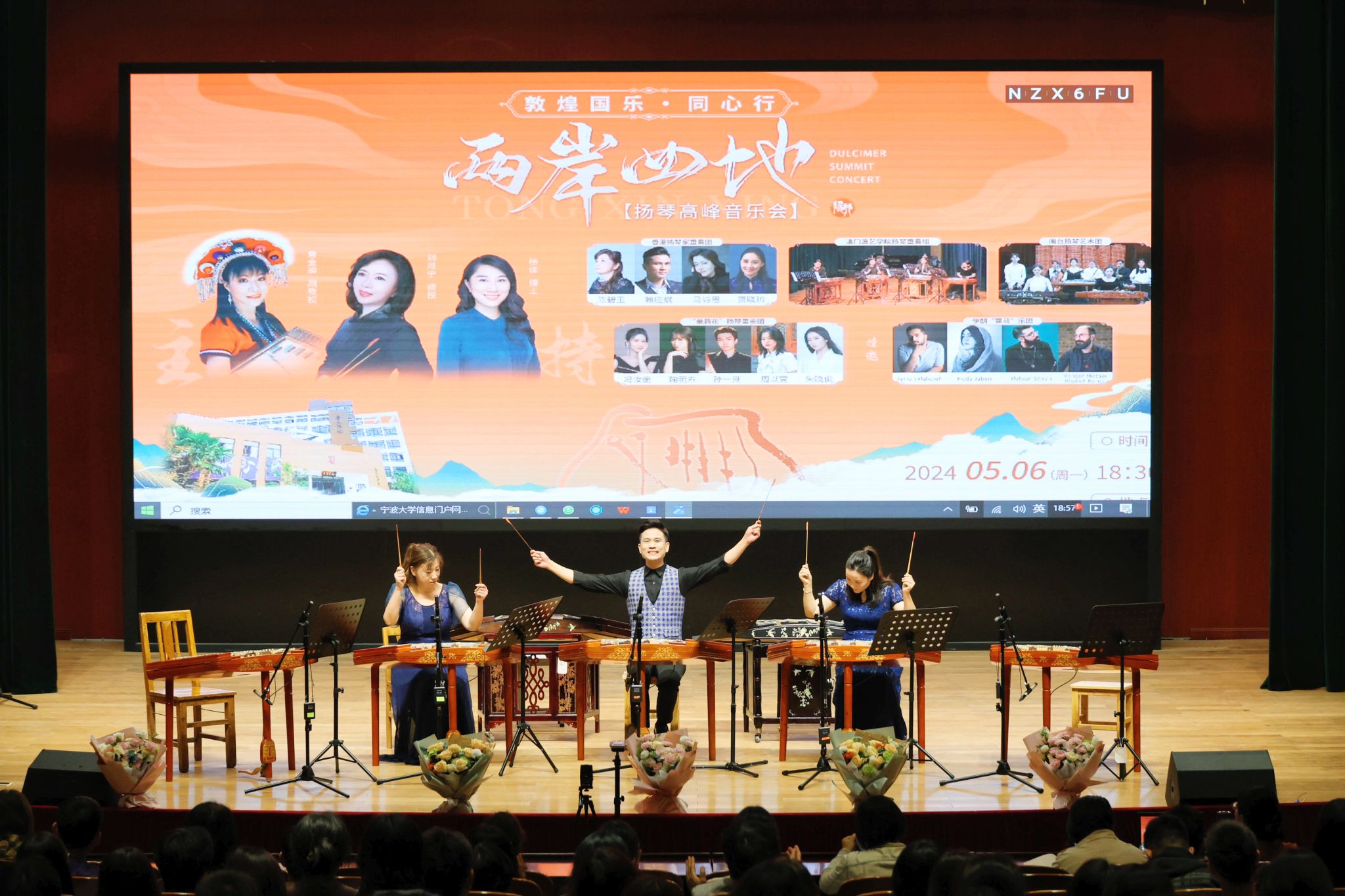 刘月宁教授作为音乐会开幕致辞嘉宾。音乐会以一首演奏家们合作演绎扬琴经典乐曲《喜讯》拉开帷幕,此曲为扬琴教育家桂习礼教授早期创作的作品之一,原名《边寨喜讯》。演出由刘月宁教授领奏,来自两岸四地的演奏家詹金娘(中国台湾)、陈碧玉、赖应斌、贺晓珘(中国香港)等演奏家与宁波大学青年教师廖松清、李珂然同台演绎。乐曲以欢快的新疆民间音调和舞蹈节奏,描绘人们听到喜讯时奔走相告,欢乐地载歌载舞的情景。扬琴作为一种表现力极其丰富的乐器,既能表现喜庆活泼的旋律,也能描绘悠扬婉转的旋律。来自澳门的青年演奏家郭嘉盈以一首悠扬的、描绘的澳门的春景《葡韵》,用婉转动人的音乐表现了扬琴在中国传统音乐中优美秀丽的一面。香港扬琴家重奏团带来的广东音乐《春郊试马》,则以欢快灵动的旋律描绘了浓浓春意中,春草初芽、试马扬蹄的意趣。乐曲既表现了“踏马游春”的中国传统文化,也表现了广东音乐在新中国成立后的蓬勃发展。伊朗“霍马”桑图尔(扬琴)乐团的演奏家Hoda Jaberi为现场观众带来了极具伊朗风格的传统乐曲《拉哈》,演奏家悠扬的吟唱与动人的中东旋律传递了伊朗传统乐器桑图尔的独特韵味。乐团“霍马”的名称来源于古代波斯神话中的吉祥鸟——霍马,是在波斯人民心目中为人民带来好运并象征着强大和吉祥的鸟儿。由传统音乐改编而来的乐曲《夜来玫瑰香》带了本场音乐会的小高潮,此曲由詹金娘将《夜来香》与《玫瑰玫瑰我爱你》两首上世纪风靡一时的经典乐曲结合,改编成为扬琴与打击乐器演奏,以通俗的旋律和精湛的技艺表现了扬琴演奏的当代变革。一首“茉莉花”扬琴重奏团的《丝路·茉莉》接续了《夜来玫瑰香》的“经典浪潮”,用家喻户晓的“茉莉花”唱响“丝绸之路,奇幻世界。崇山峻岭,马蹄声声。”,将融汇多民族音乐的多彩旋律传入在场每位观众的内心。