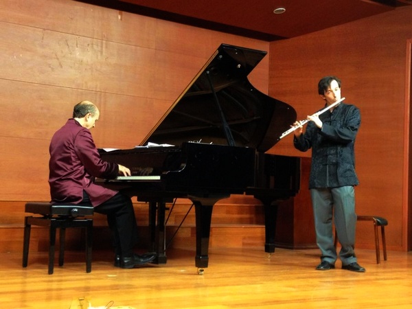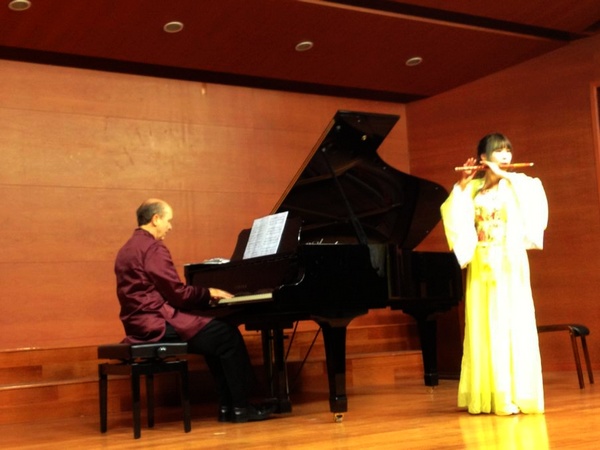 在音乐会现场,博内特·汤普森先生还与我院学生柳依依、韩瑞等同台献演了根据中国民族音乐改编的笛子曲《牧民新歌》、二胡曲《良宵》等两首作品,他们默契的配合和精彩的表演赢得了观众的热烈掌声。音乐会的压轴曲目是博内特·汤普森先生的保留曲目——美国著名作曲家格什温的代表作《蓝色狂想曲》,他那精湛的技法和深沉的演绎征服了现场的每一位观众。一曲终了,全场为之沸腾,“爵士乐之夜”音乐会在一片热烈的掌声中圆满结束。
